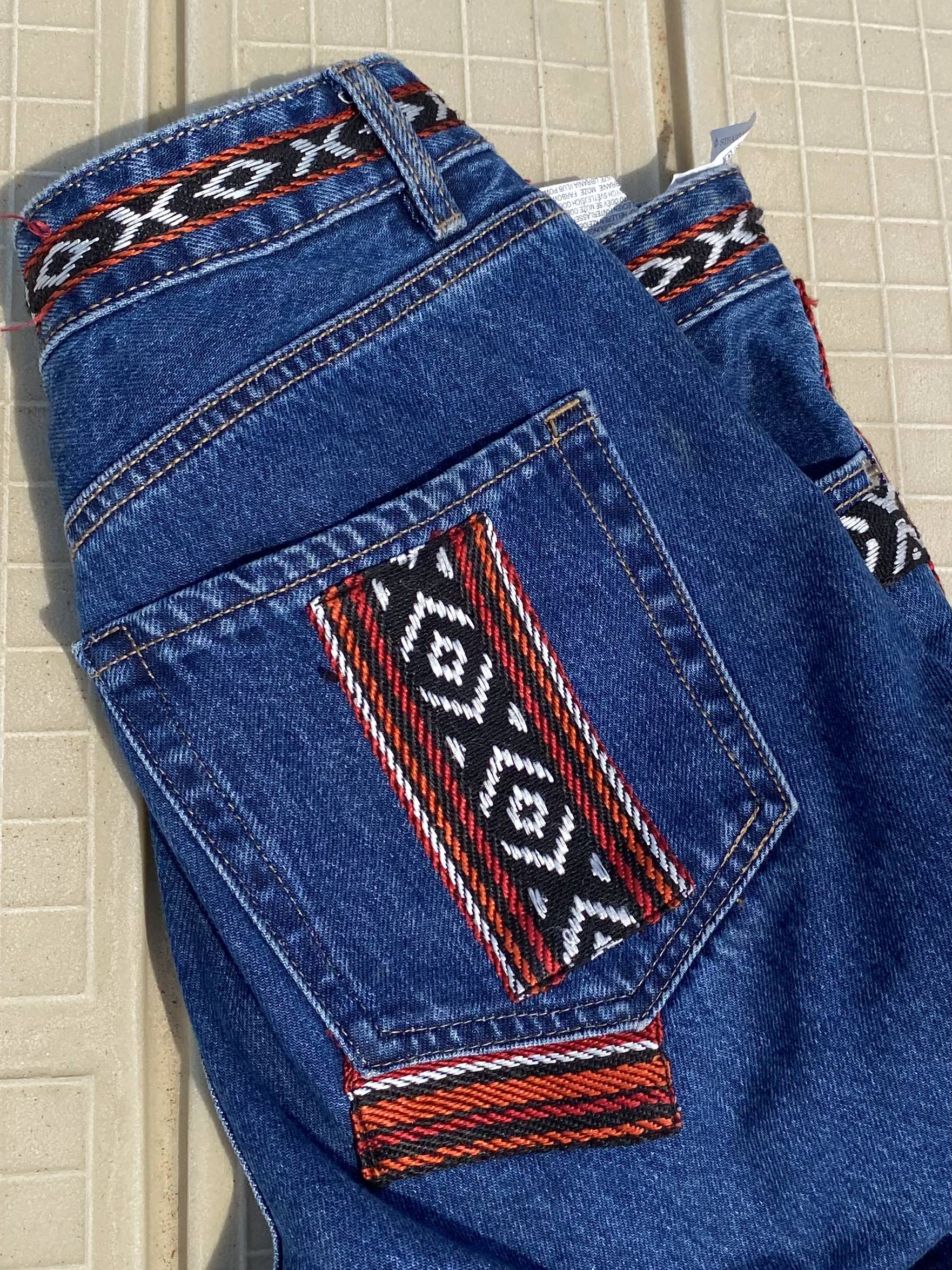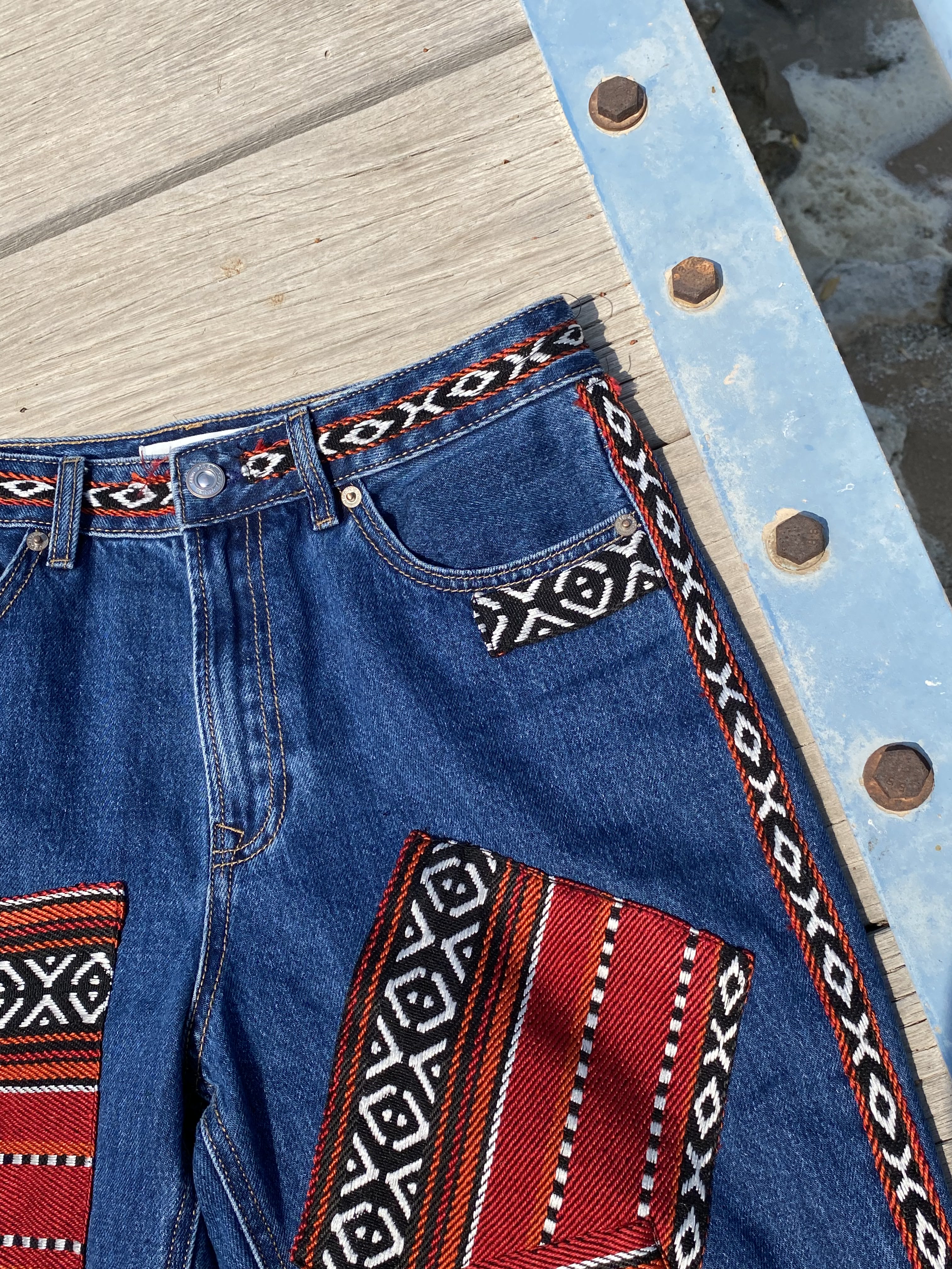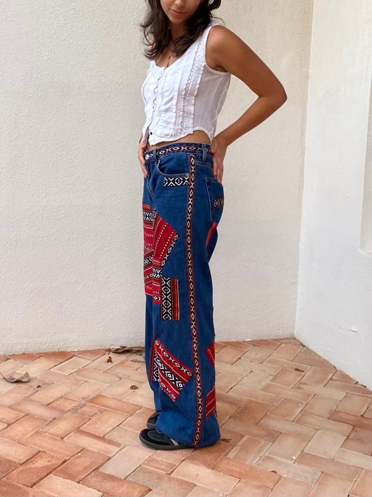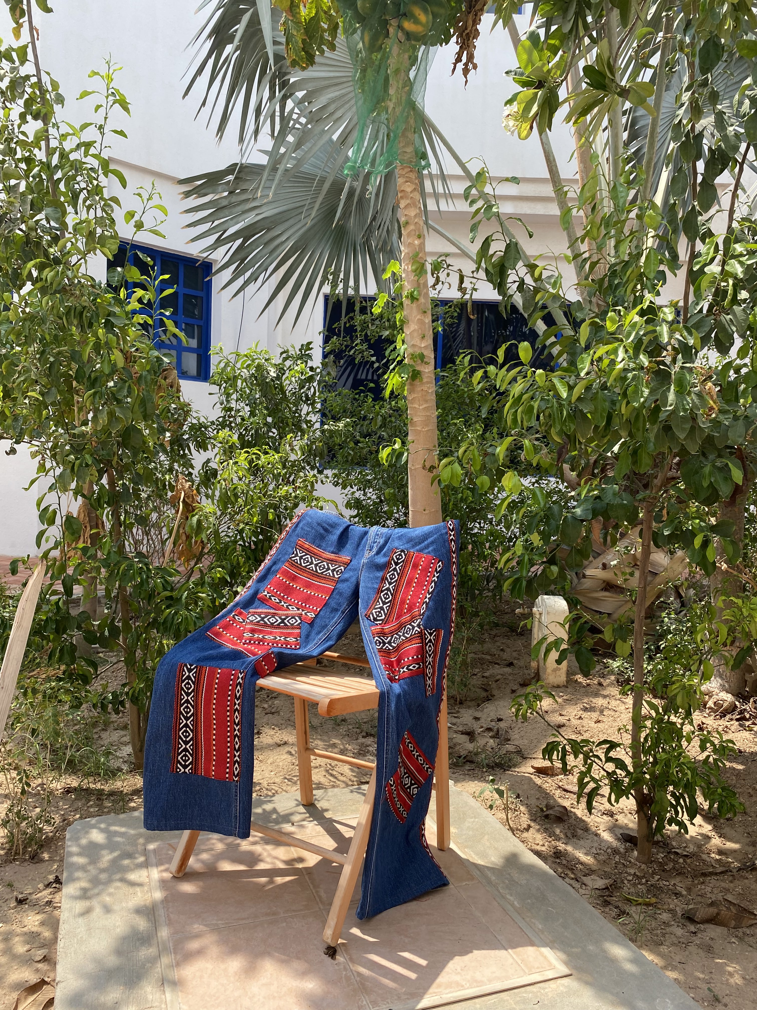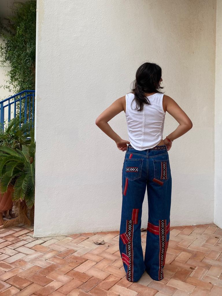 patchwork jeans inspired by traditional qatari patterns